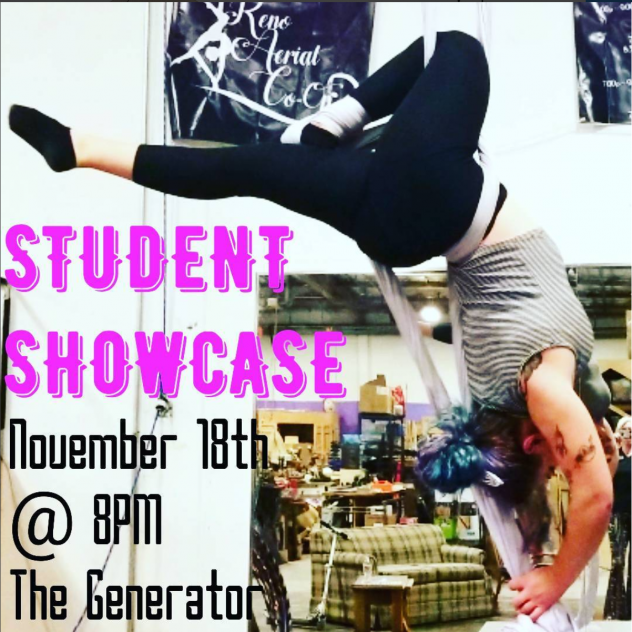 We have exciting news! Coming up the Reno Aerial Co-Op will be hosting an event November 18th. The student showcase is from 8-9pm. So students – now is your time to shine; show your family and friends all the hard work you’ve been putting in! Merchandise will be available for sale. All proceeds for the event go towards the Co-Op equipment and supporting our wonderful home at The Generator. If you’re a current student and would like to sign up, please inquire with any Co-Op instructor. All skill levels encouraged.